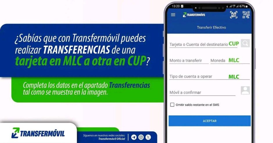 Los usuarios de la plataforma Transfermóvil pueden realizar transferencias de saldo desde tarjetas en Moneda Libremente Convertible (MLC) hacia tarjetas en pesos cubanos (CUP), como parte de las funcionalidades habilitadas en la aplicación para las operaciones entre diferentes tipos de moneda.
