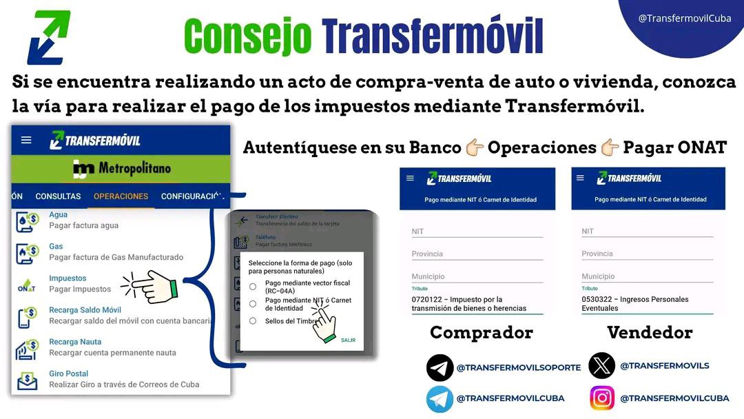 Para quienes realicen un acto de compra-venta de auto o vivienda, se recuerda la vía para realizar el pago de los impuestos correspondientes mediante Transfermóvil.