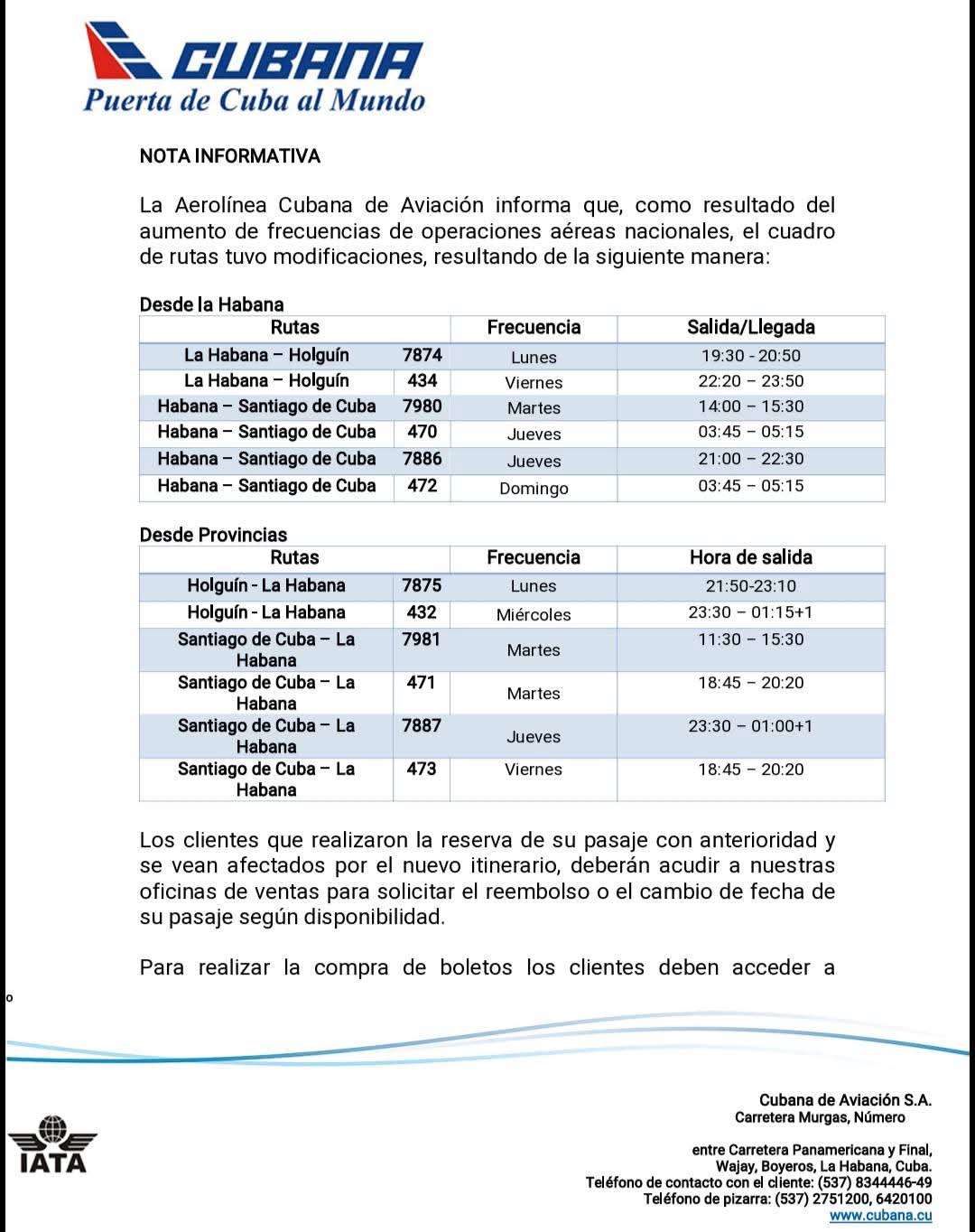 La aerolínea Cubana de Aviación informó a sus clientes a través de redes sociales que, como resultado del aumento de frecuencias de operaciones aéreas nacionales, el cuadro de rutas tuvo modificaciones.