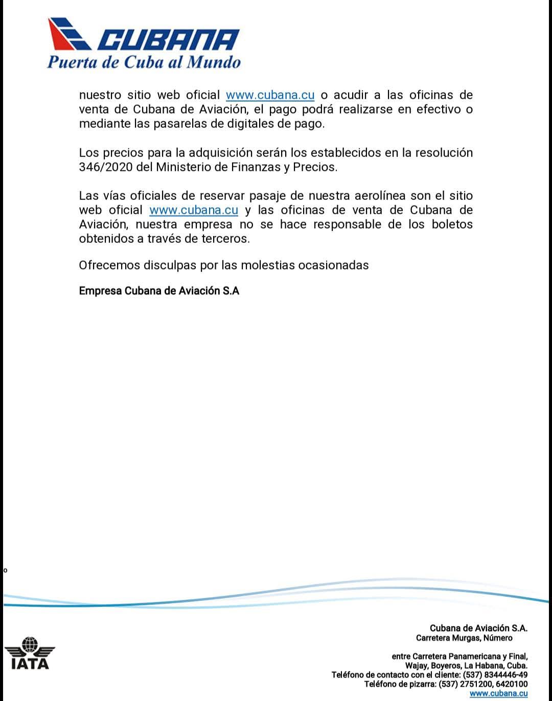 Asimismo, Cubana de Aviación emitió un recordatorio crucial para la protección de los consumidores, advirtiendo que “las vías oficiales de reservar pasaje de nuestra aerolínea son el sitio web oficial www.cubana.cu y las oficinas de venta de Cubana de Aviación, nuestra empresa no se hace responsable de los boletos obtenidos a través de terceros”.