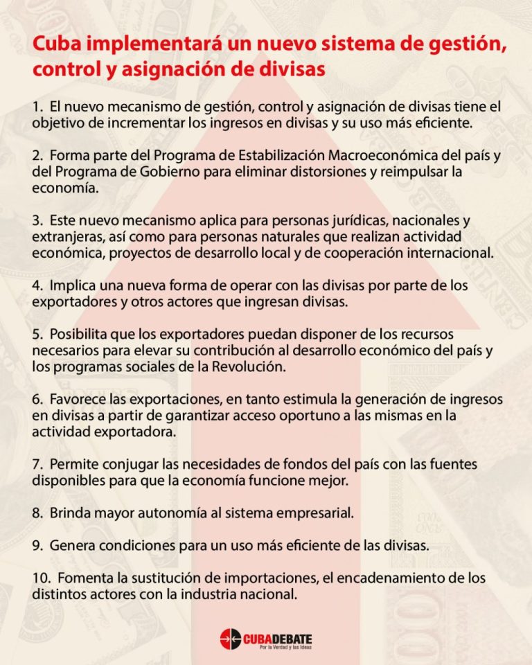 5. Estímulo a los ingresos en divisa y fortalecimiento del peso cubano: Todas estas normas están orientadas a estimular los ingresos en divisa al país, que es identificado como el principal problema actual. En la medida que se incrementen esos ingresos, se resolverán más rápidamente los desequilibrios monetarios. El objetivo estratégico final que se mantiene es que el peso cubano sea el centro del sistema financiero del país.