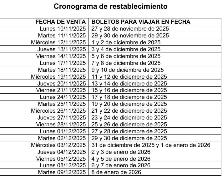 Adicionalmente, se informó que a partir del martes 9 de diciembre se restablecerá el ciclo normal de venta anticipada, que permite la compra de boletos con hasta 30 días de antelación.