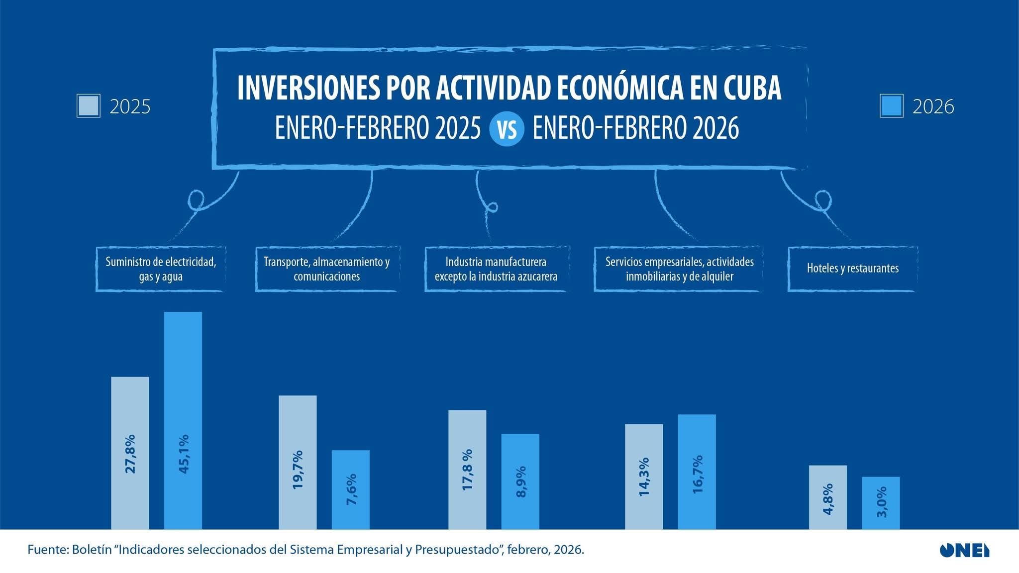 La Oficina Nacional de Estadística e Información (ONEI) publicó este mes el boletín “Indicadores Seleccionados del Sistema Empresarial y Presupuestado” correspondiente al período enero-febrero de 2026, excluyendo a las MIPYMES y cooperativas.